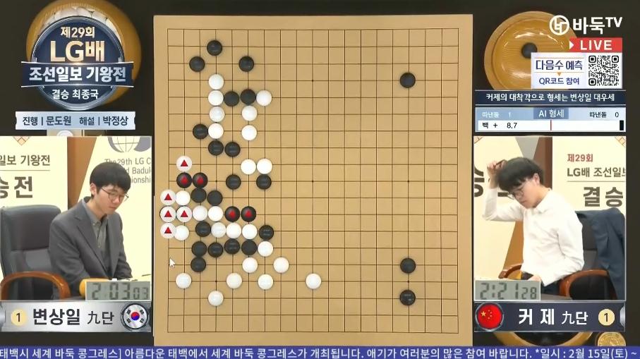然而,就在比赛继续进行的时候,裁判意外选在卞相壹的回合暂停了比赛,告知柯洁的失误并处罚。